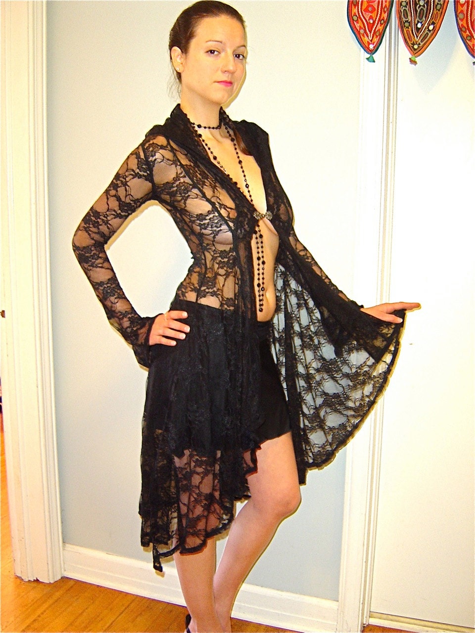 This long fitted and flowy hoodie coat is made from stretch lace. It is perfect bedroom lingerie, or it can be worn layered for a boho look out on the town.