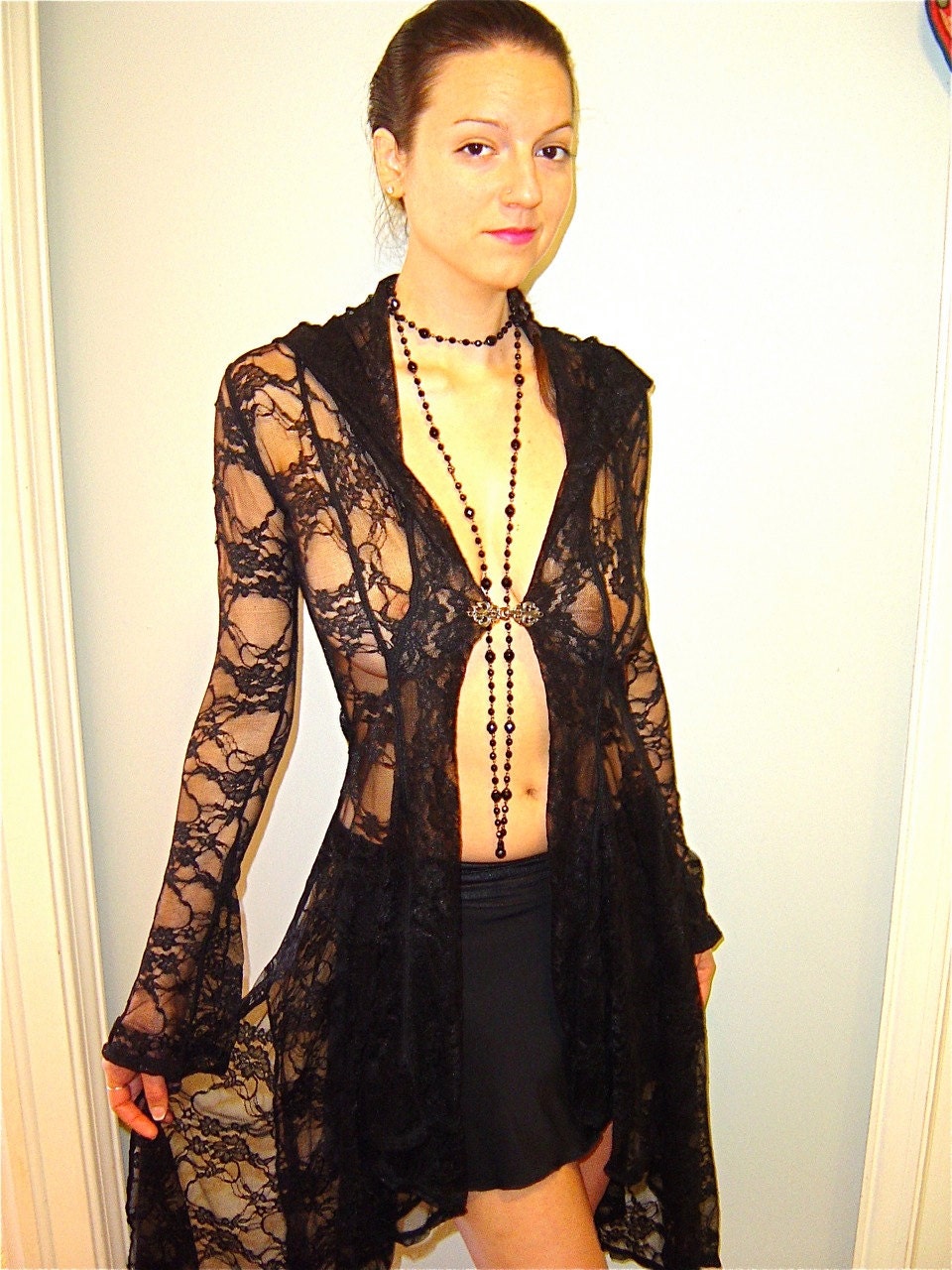 Diana Lingerie Long Fitted Jacket Hoodie Maxi Coat Robe in Lace | Bridal Wear, Priestess Robe, Gothic, Strega Witch, Dark Fairy Costume