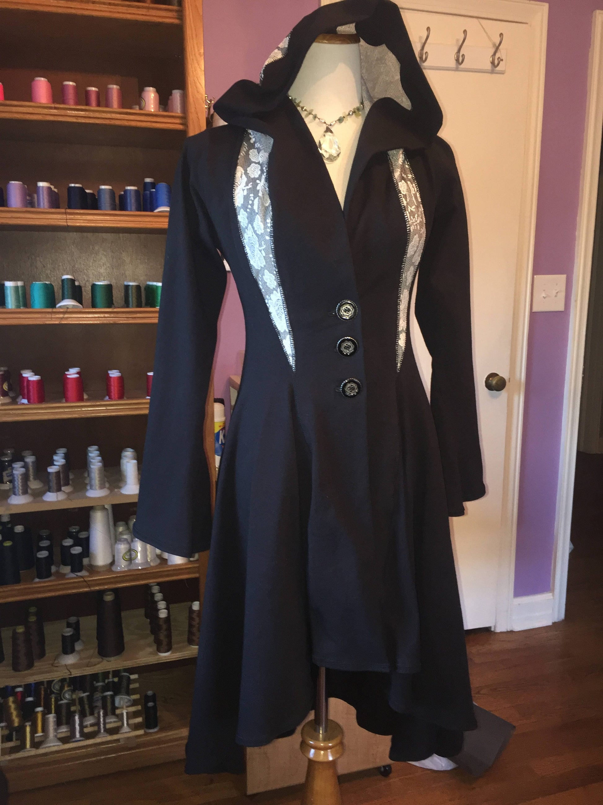 Medium only left - the Diana hooded maxi jacket is both elegant and enchanting. Organic black cotton lycra and silver gray hood. This long fitted and flowy coat has a unique look that crosses a variety of styles and therefore can be worn in versatile settings… a night out on the town, a day out with friends, a special ceremony, a cosplay costume, a Renaissance festival, Burning Man, and more.