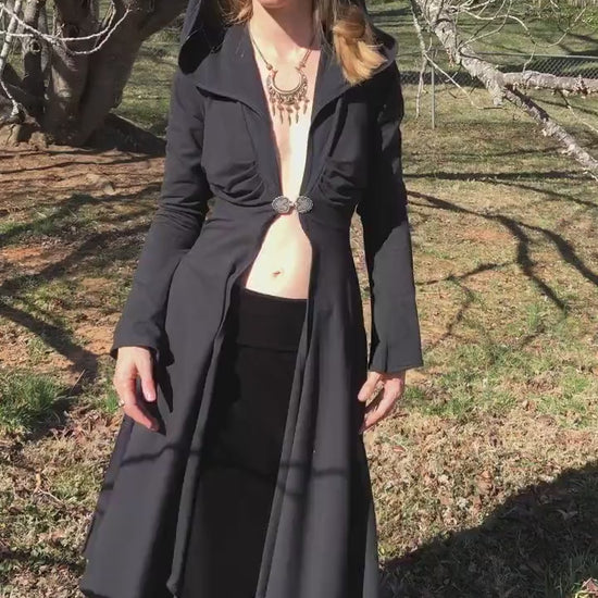 Dominique Stretch Cotton Organic Hooded Fitted Maxi Jacket, Priestess, Black Fairy Coat, Elven, Medieval Costume, Gothic Hoodie, Medium ONLY