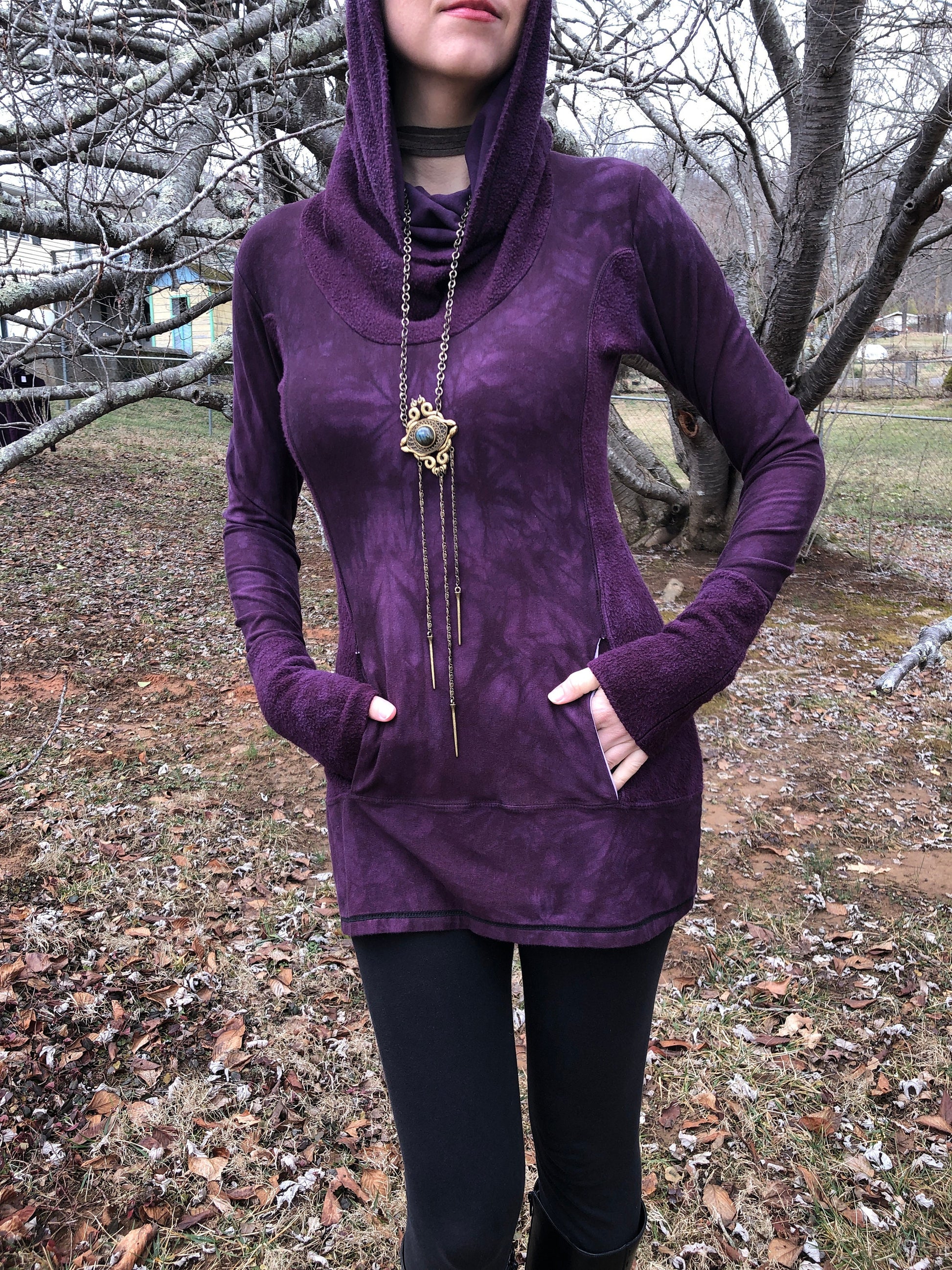 Hand-dyed Bamboo/Hemp Athleisure Cowl Hoodie. Burgundy Stretch Jersey and Fleece. Kangaroo pocket. Long Line Tunic, Boho, Scrunch Cuffs