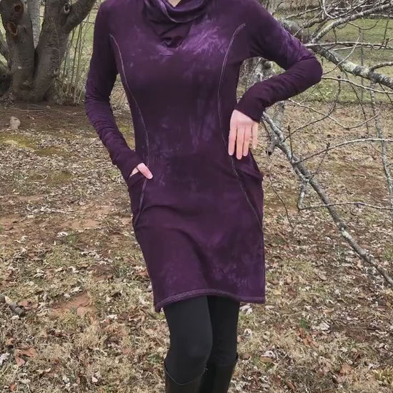 The Zoe hand-dyed, durable, athleisure dress with cowl neck hood and pockets. Burgundy stretch bamboo/hemp soft jersey body and hood. Fuzzy side out Terry on the side panels and cuffs. Team up with your favourite boots.
