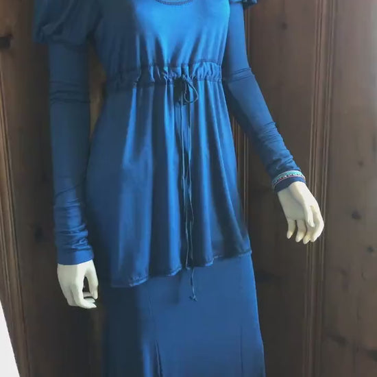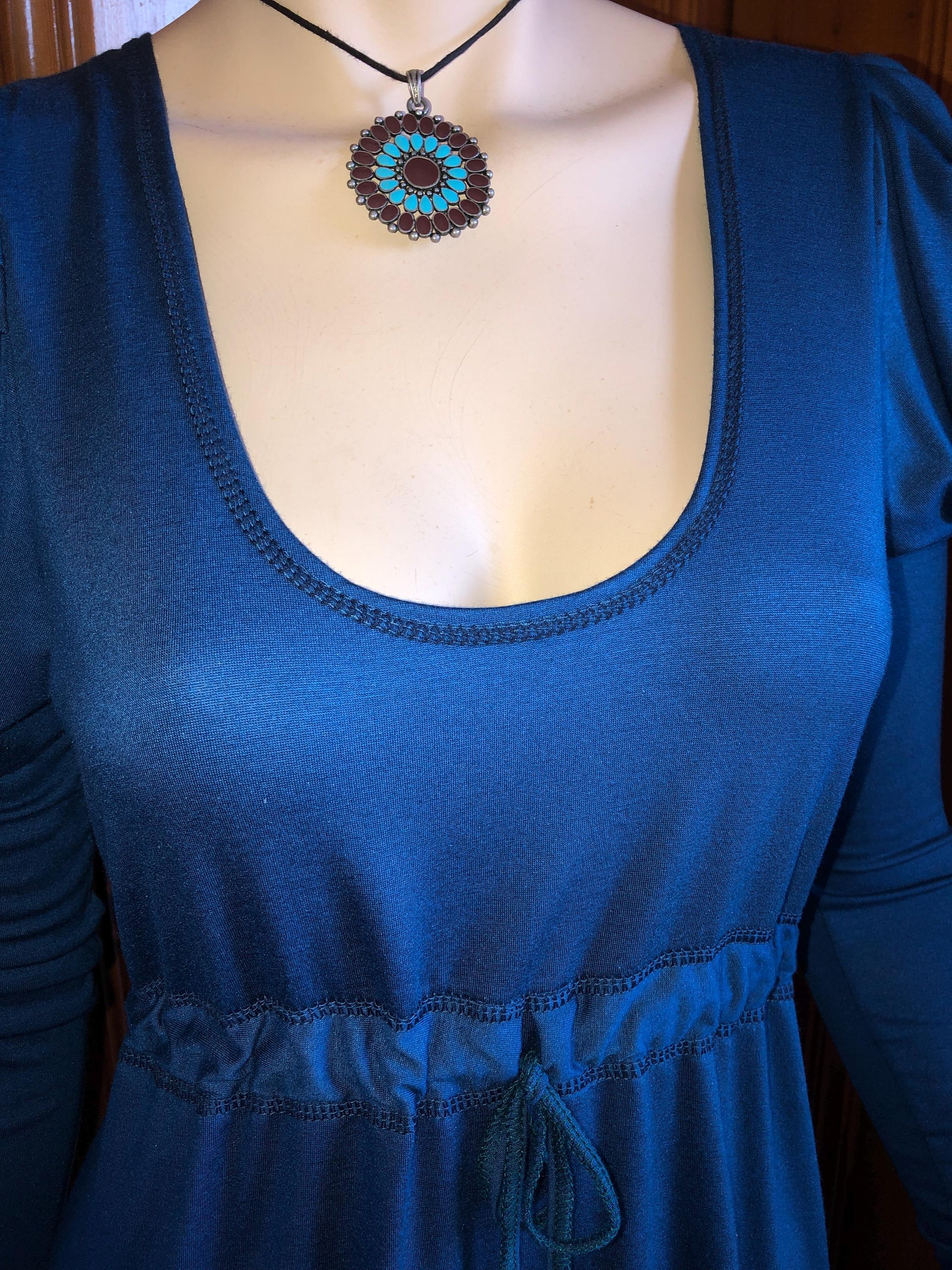 Beautiful puffed upper sleeve and fitted lower sleeve. Long cuffs to scrunch up/down as you need. Skims over hips; elegant and boho. Hem generally lands just below your crotch level. Flattering scoop neck to show off your necklace or scarf.