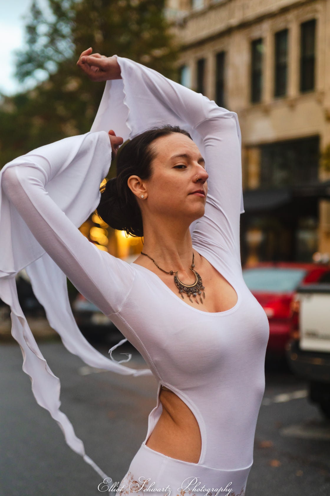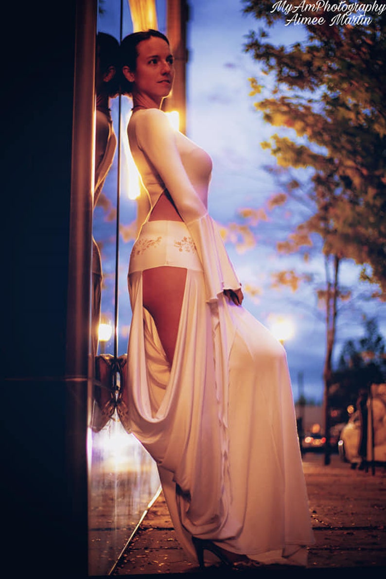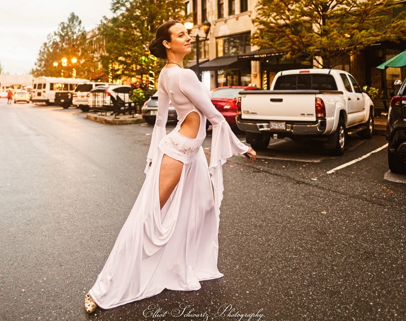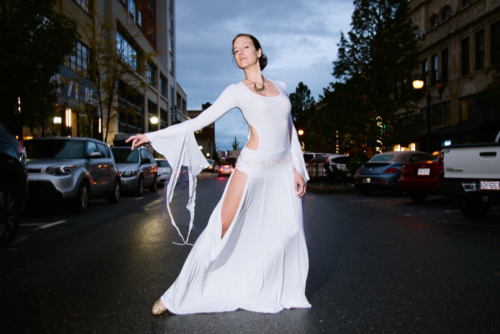This sensational dress has long flowing medieval sleeves that flutter as you move. Wear as an alternative wedding dress, your next performance, ritual, a fairy costume, or incorporate it into your dance wear collection.