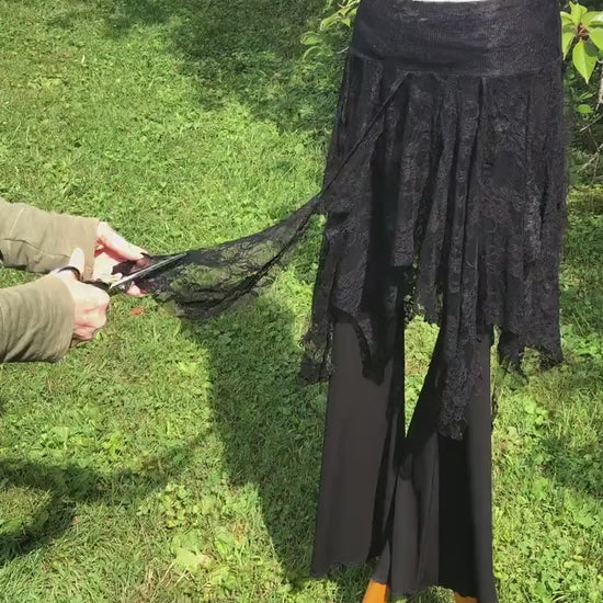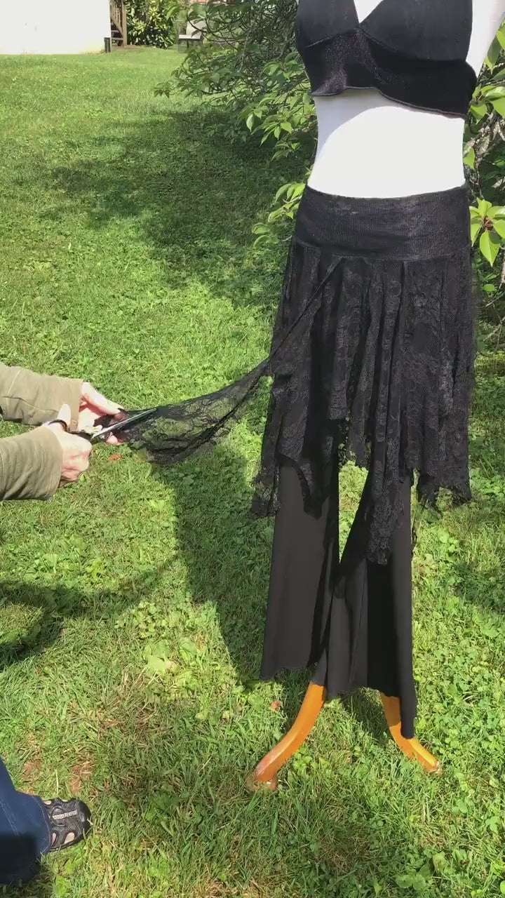 This skirt has long flowing strips of stretch lace fabric that flutter and dance as you move. See the video as how you can further cut into the strips for greater "fringing" if you so desire!
