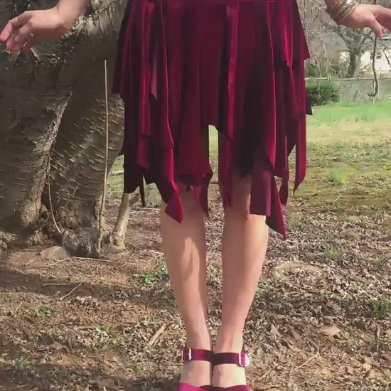 This delightful dance skirt has unfinished tendrils of cascading velvet fabric that folds and flutters as you move. Wear it at festivals with a crop top or build into your performance costume. Worn on the lower hips.