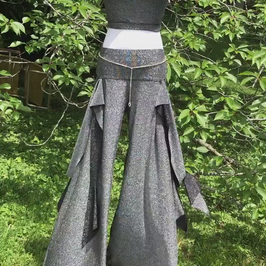 Silver Sparkle Sakura Open Hip Dance Pants, Low Rise, Wide Leg Flare, Bellydance Performance wear, Boho, Fairy, Elven, Burning Man, Harem