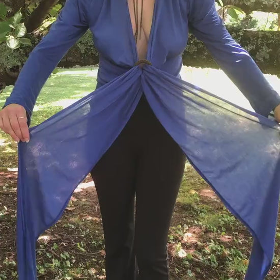 The Olivia Wrap Top Long Sleeves in Cobalt Blue Tencel - Layering Top, Tie Top, Bohemian Fairy Top, Brass like O Ring Feature