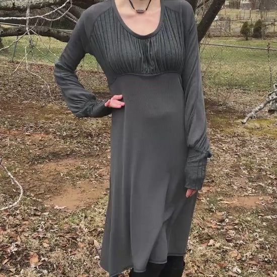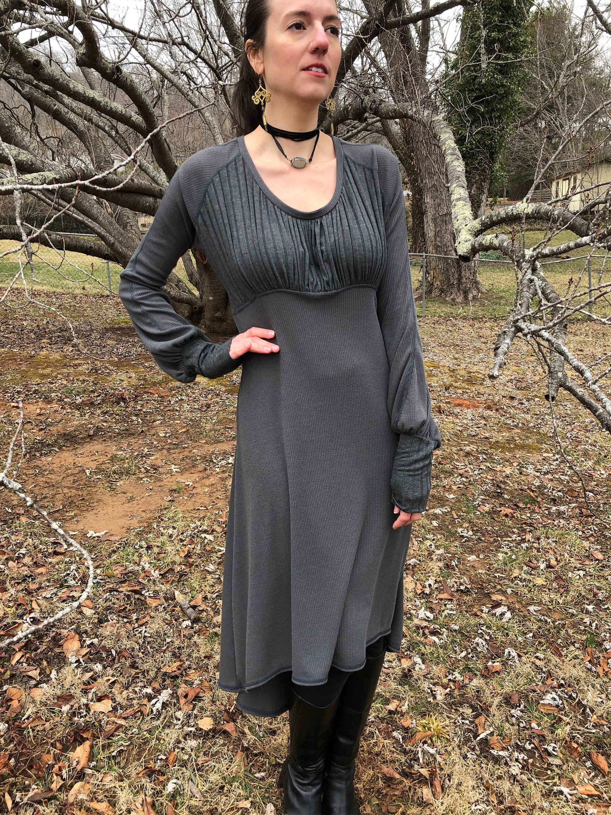 Willow Dress - Long Bell Sleeves, Cloud Grey Stretch Knit, Flowy, Winter Boho, Subtle Bodice Stripes
